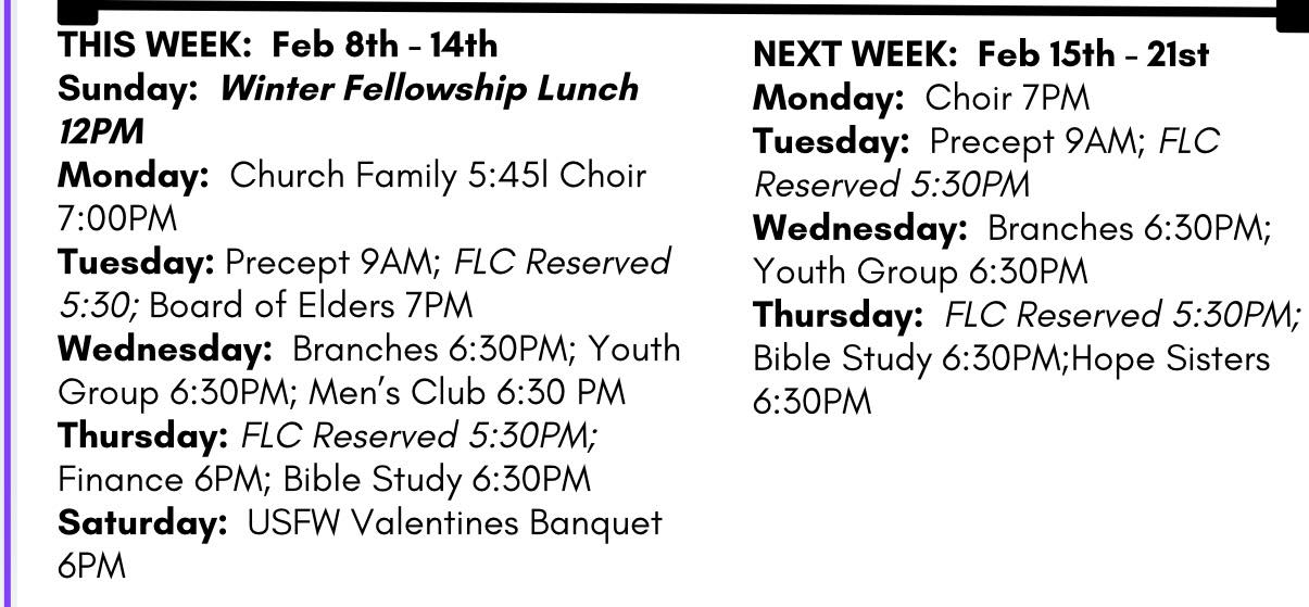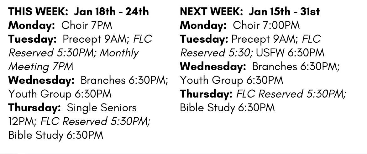 Participate in our weekly Bible study groups to deepen your understanding of scripture and strengthen your faith. Groups meet on Sundays at 9:30 AM and Wednesdays at 6:30 PM.