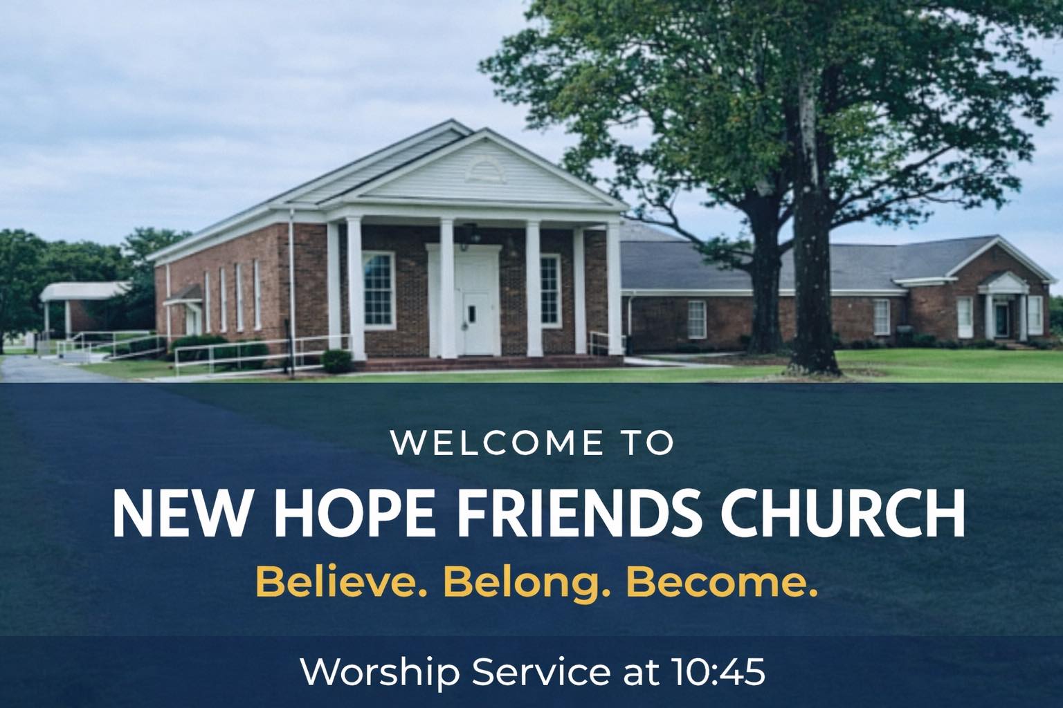 New Hope Friends Church is a welcoming community dedicated to nurturing faith, fostering fellowship, and serving others. Our mission is to create a space where individuals can grow spiritually and connect with one another. We value compassion, inclusivity, and the transformative power of faith.